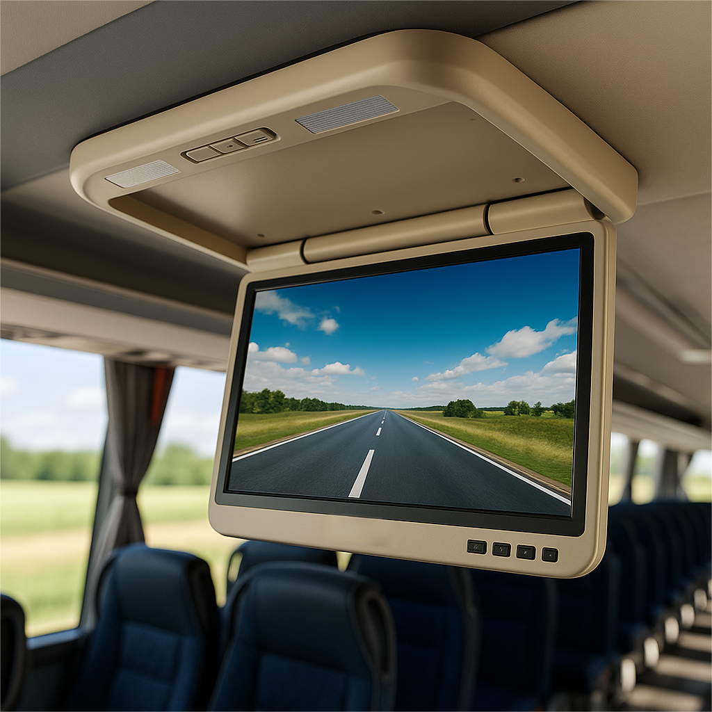 A roof-mounted monitor is a screen installed on the ceiling of a vehicle—typically in buses, MPVs, or luxury coaches. It offers passengers visual access to movies, route updates, ads, or safety messages.